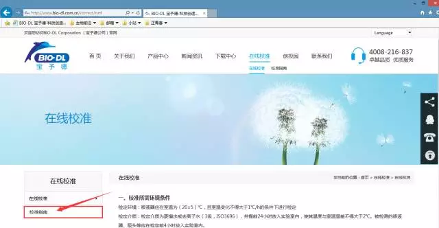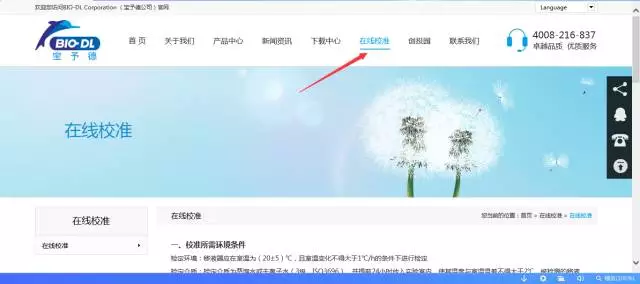 2.點擊下圖紅色箭頭指示的“在線校準(zhǔn)”進(jìn)入移液器在線校準(zhǔn)服務(wù)。