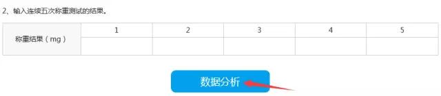 6.根據(jù)移液器校準(zhǔn)指南操作,讀取天平讀數(shù),輸入下示表格,并點擊藍(lán)色按鈕“數(shù)據(jù)分析”。